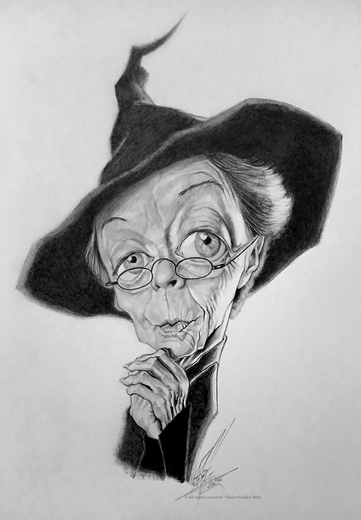 a caricature of Minerva McGonagall, the fictional character in the Harry Potter series of novels by J. K. Rowling, played by the British actress Maggie Smith (1934-2024) in the Harry Potter films